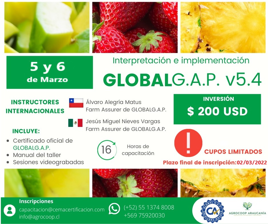 Curso dirigido a interesados en Opción 1 (Requerimientos generales sin sistema de gestión de calidad) y Opción 2 para grupo de productores. El esquema GLOBALG.A.P. tiene como objetivo asegurar el correcto desarrollo, implementación, mejora, integridad, transparencia y armonización de los productores agropecuarios.